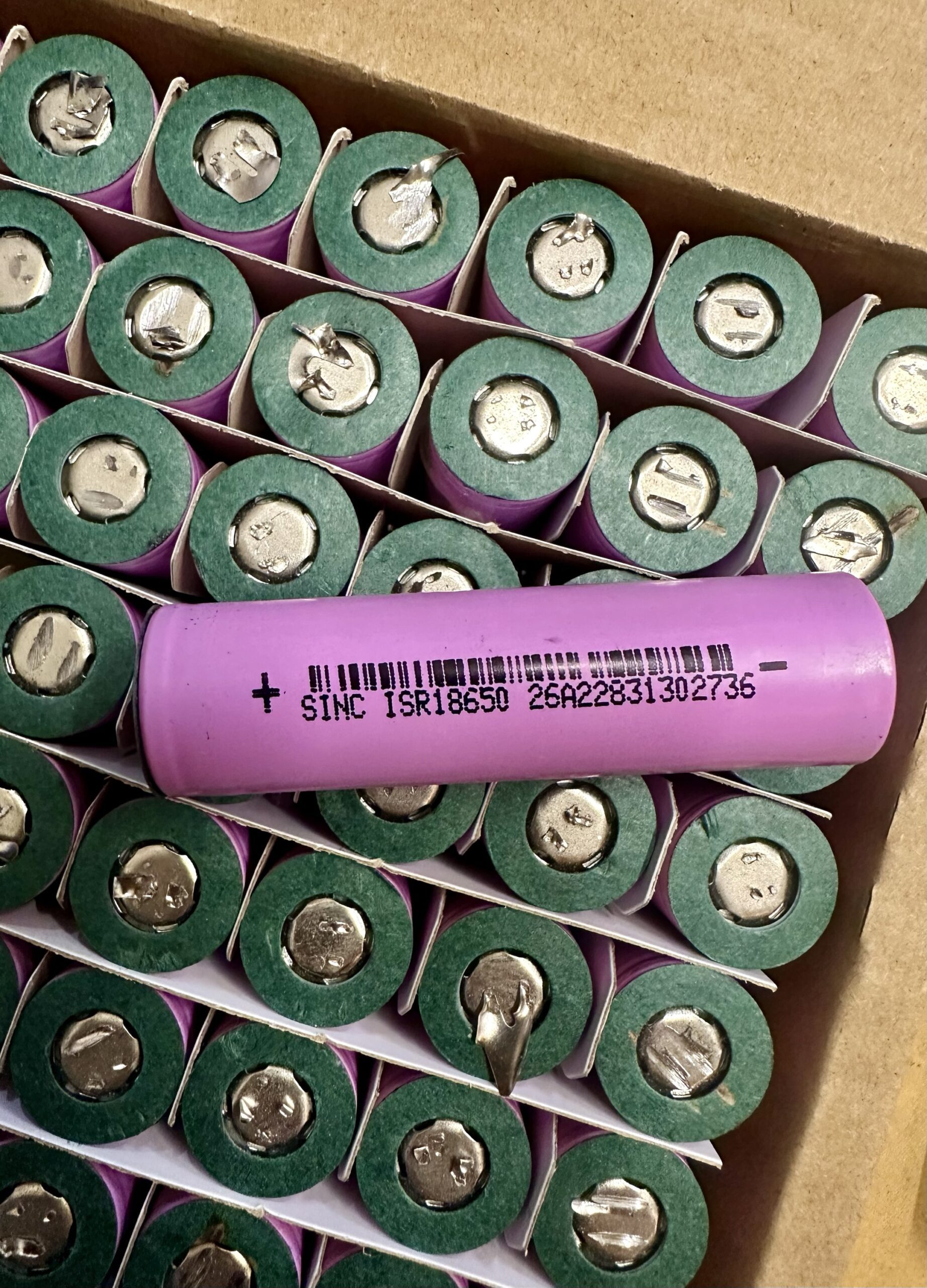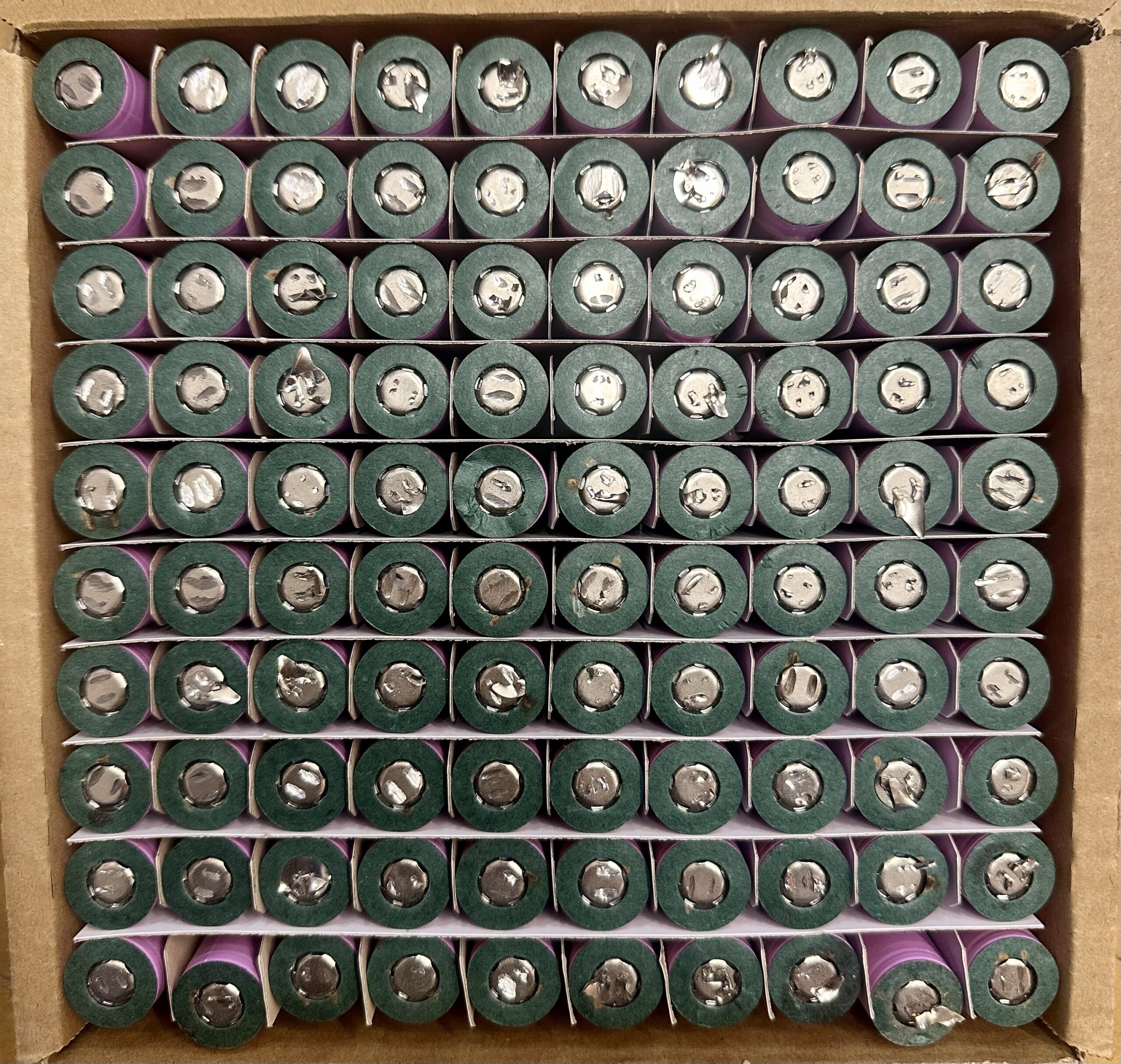 Diese Box enthält 100 gebrauchte 18650-Zellen, die aus Akkupacks mit defektem BMS oder einer fehlerhaften Zellreihe stammen.